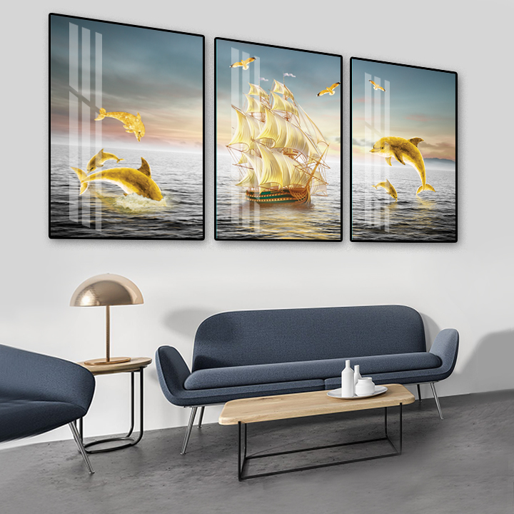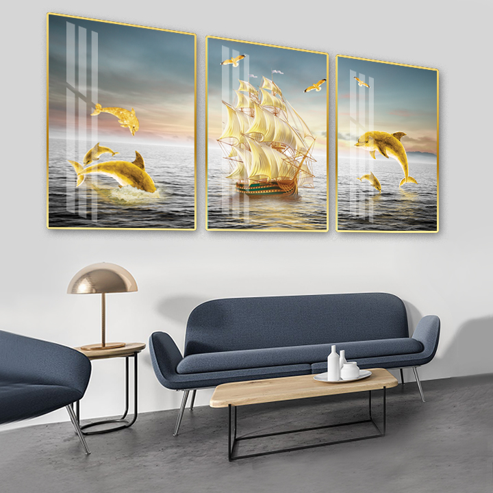 Bộ 3 tranh treo tường thuận buồm xuôi gió với cá heo không chỉ có giá trị về mặt thẩm mỹ khi đem lại sức sống, làm sáng bừng căn phòng mà về mặt phong thủy nó còn giúp kích hoạt tài lộc, tăng cường vận may cho chủ nhà, nhất là những doanh nhân, người làm nghề buôn bán sẽ luôn gặp thuận lợi, suôn sẻ.